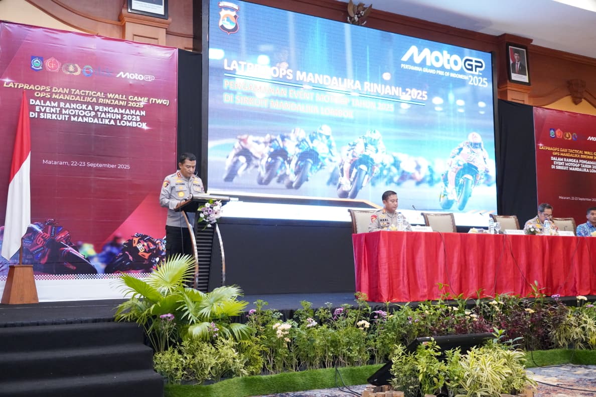 Mataram, NTB – Dalam rangka Pengamanan Event MotoGP Mandalika 2025, Polda NTB menyelenggarakan Latpraops Mandalika Rinjani 2025 yang dirangkaikan dengan Tactical Wall Game (TWG) yang berlangsung di Ballroom Hotel Lombok Raya Mataram, Senin (22/09/2025).