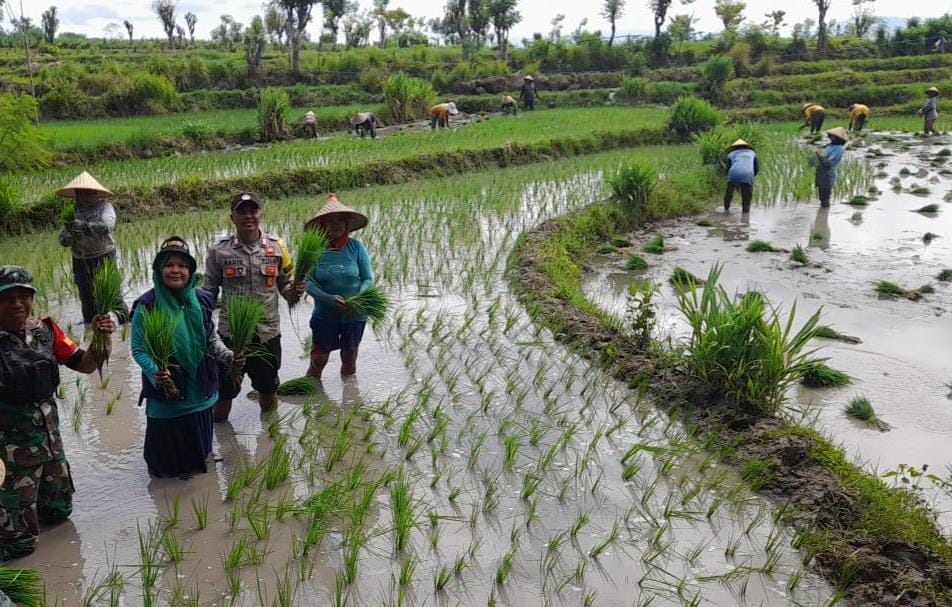 Wujudkan Indonesia Yang Swasembada Pangan, Bhabinkamtibmas Polsek Madapangga Ikut Menanam Padi( Oplan) Kementan RI